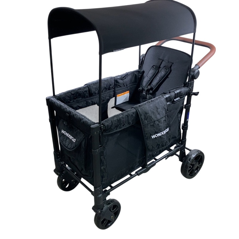 This updated wagon is amazing! It can hold up to 2 kids and includes 5 point magnetic harnessed seats with a slidable/removable large canopy. If you want to use this wagon without seats, the seats are removable. This wagon has great updated features such as a front zipper for easy access, an adjustable push handle with vegan leather, a 1 step foot brake, all-terrain XL tires, and an amazingly small fold. This wagon holds up to 200 pounds and 45 pounds for each seat.