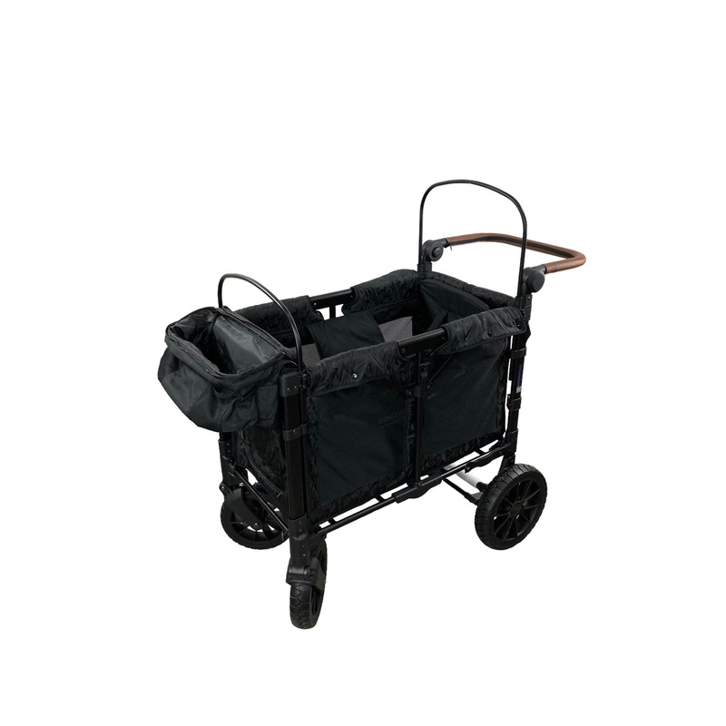 This updated wagon is amazing! It can hold up to 2 kids and includes 5 point magnetic harnessed seats with a slidable/removable large canopy. If you want to use this wagon without seats, the seats are removable. This wagon has great updated features such as a front zipper for easy access, an adjustable push handle with vegan leather, a 1 step foot brake, all-terrain XL tires, and an amazingly small fold. This wagon holds up to 200 pounds and 45 pounds for each seat.