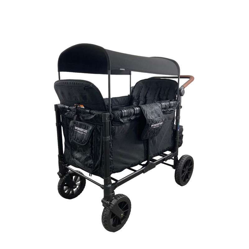 “This wagon is amazing! It can hold up to 4 kids and includes magnetic harness seats a large canopy and tons of storage. If you want to use without seats, the seats are removable. There is a sturdy mattress style bottoms for naps. Canopy provides UV protection and there is a convenient storage basket. This premium version has XL All-Terrain PU (Polyurethane) tires with suspension, an extended handlebar with vegans leather, and holds up to 300lbs.”