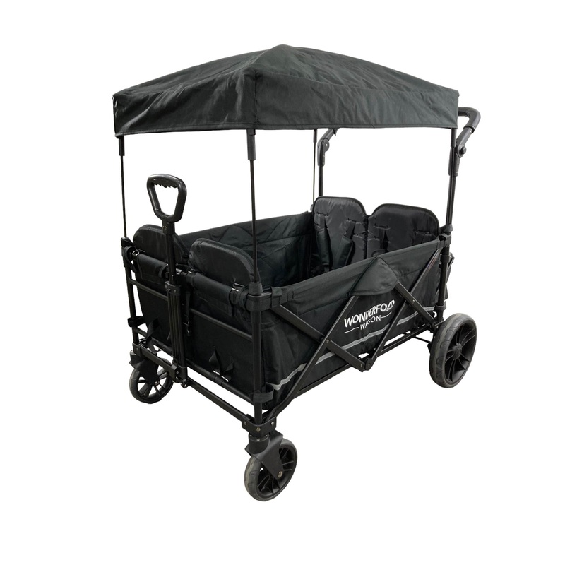 This wagon is amazing! It can hold up to 4 kids and includes harnessed seats with a large canopy. There is a sturdy mattress style bottom for naps. Canopy provides UV protection and there is a convenient storage basket. Holds up to 180lbs.