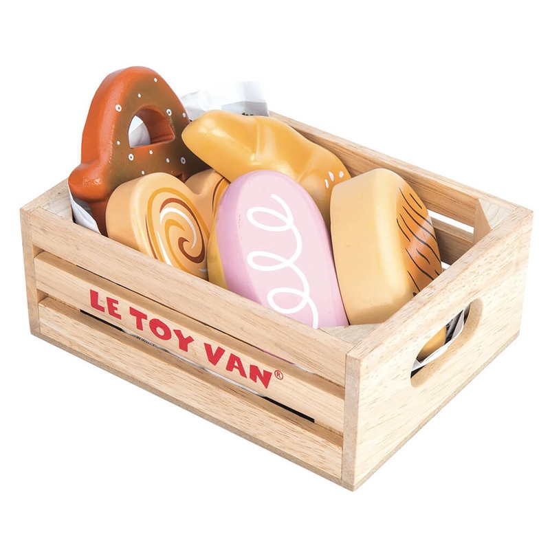A crate of wooden breads including a pretzel, an iced bun, a croissant, a pain au chocolate and a swirl bun.