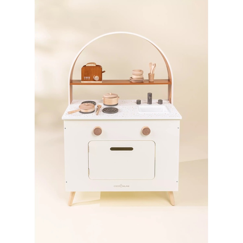 The Wooden Play Kitchen is so much fun! Youll appreciate all the little details that give it a more realistic look, without compromising the product’s sturdiness.Its colorful and retro design provides a unique style to it!