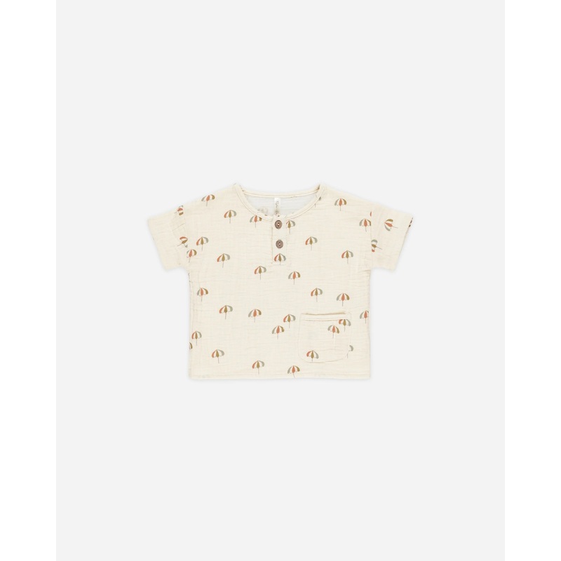 This short sleeve woven henley tee features a crew neck with button front and a front pocket.