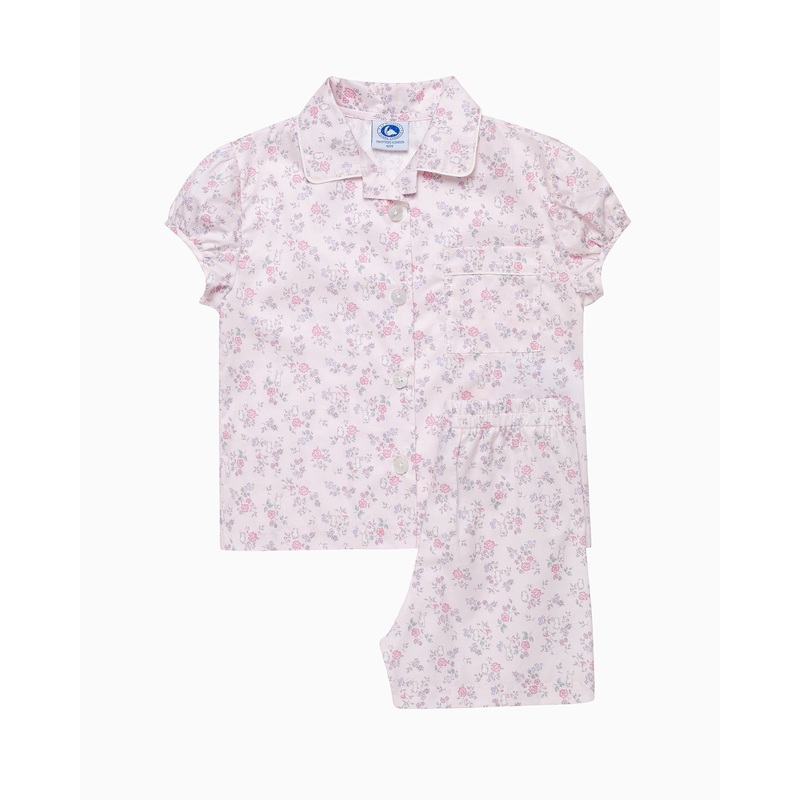 These smart summer pajamas are comprised of a pair of pink floral bunny printed shorts and a short-sleeved shirt to match. Made in a lightweight 100% cotton fabric that will keep them feeling fresh all summer long, the top also features a breast pocket for