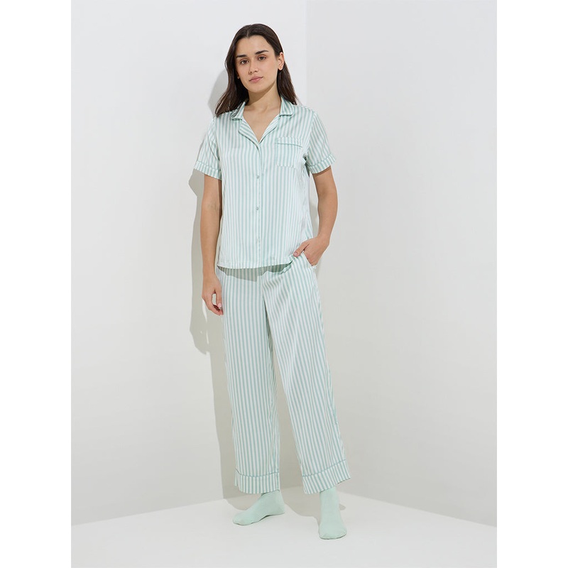 Wunderlove presents this sage loungewear set, adorned with timeless stripe prints for a chic, relaxed vibe. Crafted from an ultra-lightweight fabric, the shirt features a classic notched collar, button-up front, short sleeves, and a welt pocket for a refined touch. The matching pyjamas are designed with an elasticated waist and functional side pockets.
