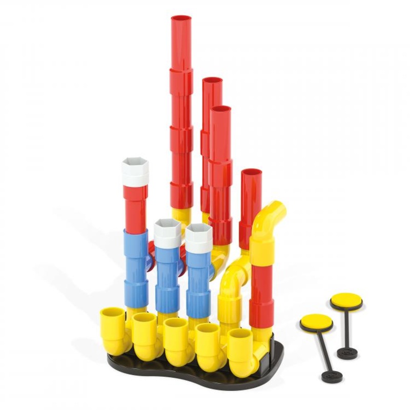Construct a real xylophone by joining coloured tubes. The sound changes according to the length and shape that the child chooses for the pipes. Xylopipes has open tubes that act as resonators, amplifying the sounds. The pitch of the notes can be varied by changing length and shape, using the 40 pieces included. The various sounds are made by hitting the open pipes with the sticks provided. An original and creative way to introduce children to the world of music.