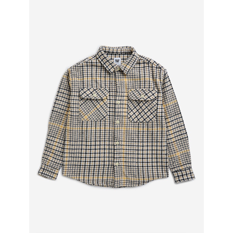 This beige shirt from Y&F Kids highlights checkered prints. Made from pure-cotton, it comes fitted with a classic collar that extends to a button placket and full sleeves. The welt pockets add a practical finish.
