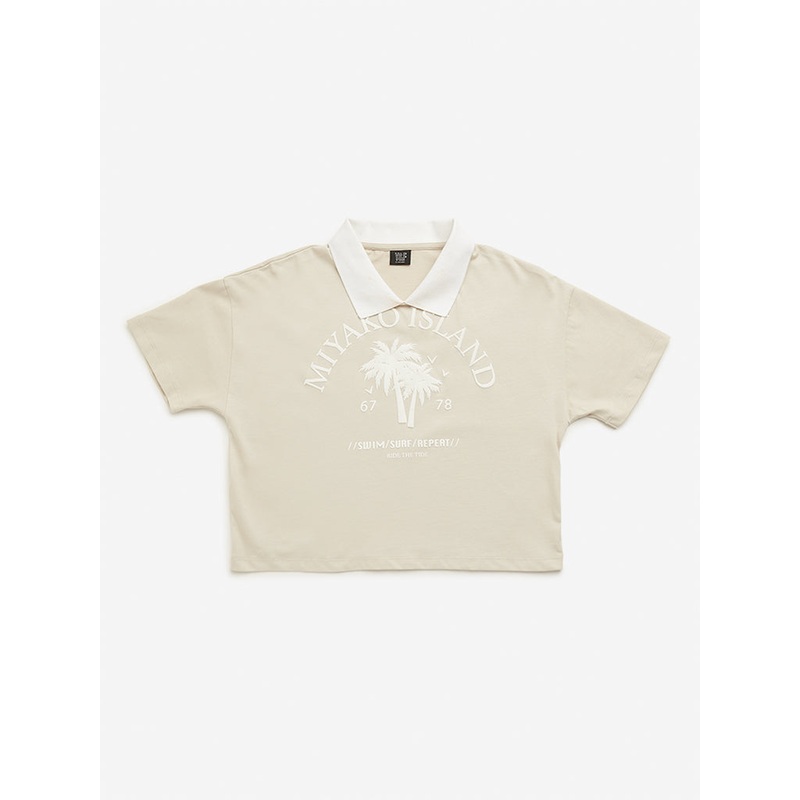 This beige crop t-shirt by Y&F showcases captivating text designs along with a classic collar and short sleeves, all crafted from breathable fabric for ultimate comfort.