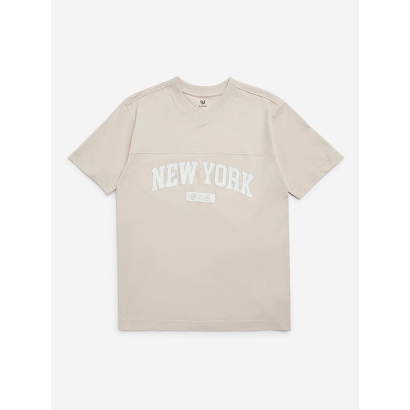 Showcasing bold text prints at the front, this beige t-shirt from Y&F Kids is crafted from a soft cotton-rich fabric for all-day comfort. Designed with a classic ribbed V-neck and short sleeves, it offers a stylish yet easy going fit for everyday wear.