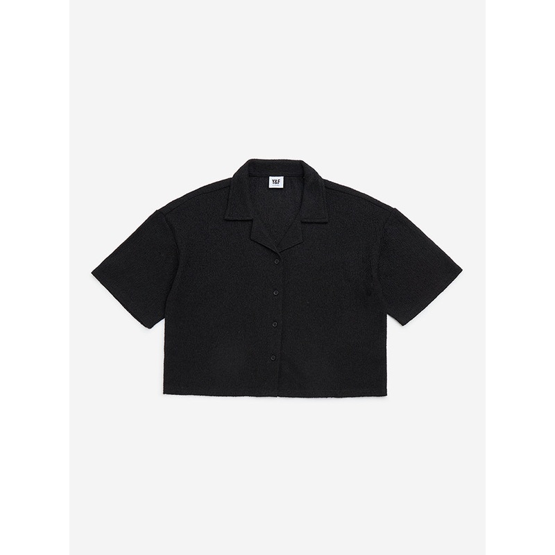 Y&F Kids launches this black shirt in a self-textured profile. Woven from a cotton-blend material, it features a camp collar that extends to a button-up front and short sleeves.