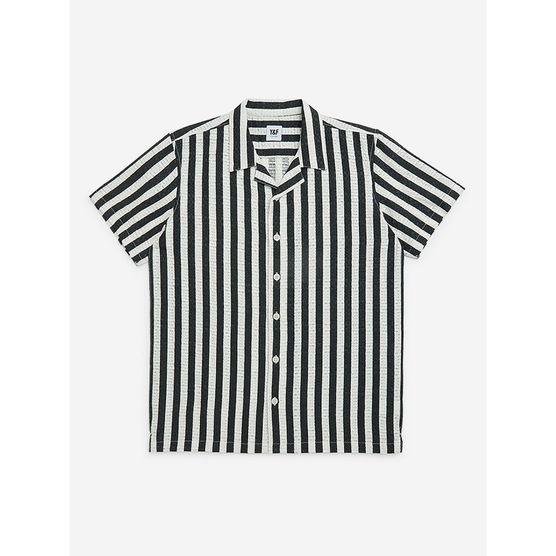 Y&F Kids launches this black shirt exhibiting stripe patterns, styled with a camp collar, a button-up front and short sleeves. Fashioned from a lightweight fabric with a textured finish, it offers superior comfort, making this piece a versatile pick for casual wear.