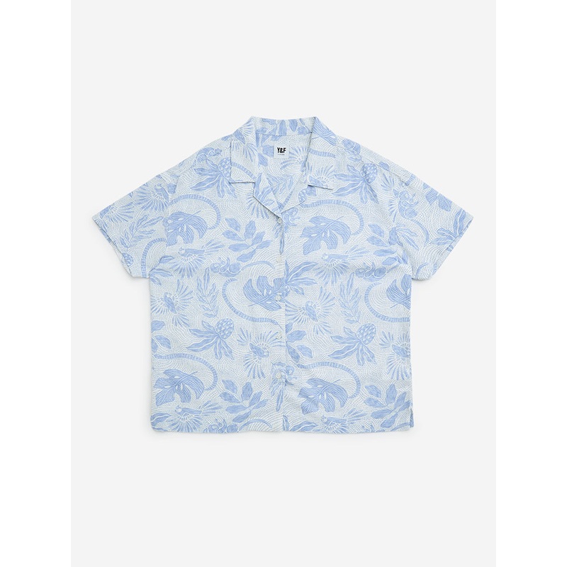 Y&F Kids introduces this blue shirt featuring botanical prints, crafted from cotton-linen blend fabric. Featuring a camp collar and short sleeves, its a versatile staple for casual dressing.