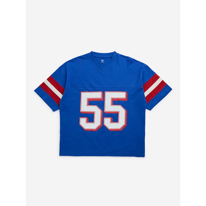 Y&F Kids presents this blue t-shirt featuring text prints It is made with pure cotton and includes a V-neck and short sleeves adorned with red and white stripes.