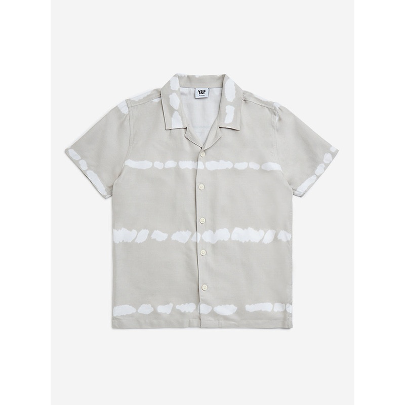 Y&F Kids unveils this grey shirt featuring abstract prints in the front and back. The soft and breathable fabric garment is carved in a relaxed-fit. It is complemented with a camp collar, buttoned placket, and short sleeves.