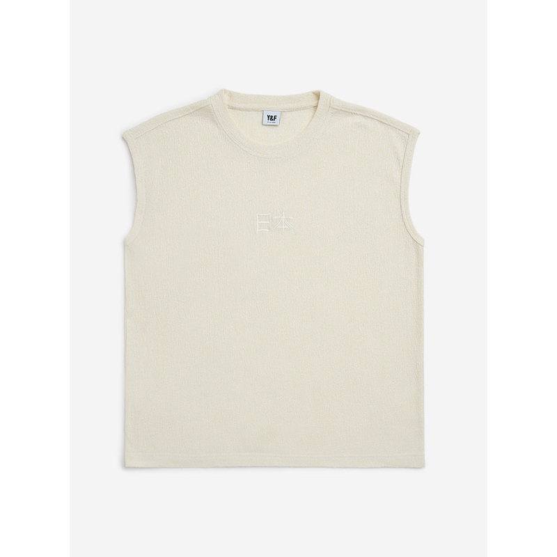 This off-white t-shirt from Y&F Kids is crafted from a self-textured fabric with a crew neck and sleeveless cut. The dainty embroidered detailing at the front lends a playful charm.