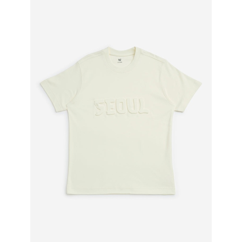 This off-white cotton t-shirt from Y&F Kids features an embossed text design for a stylish touch. Designed with a classic crew neck and short sleeves, it offers a comfortable and trendy look for casual wear.