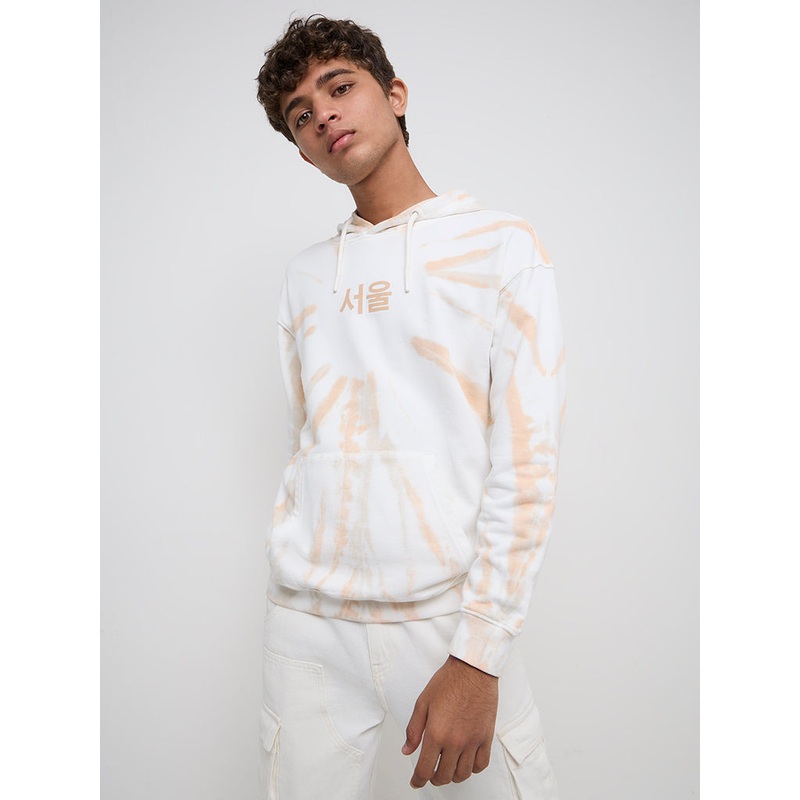 This peach sweatshirt by Y&F Kids is made from pure-cotton for sumptuous comfort. Showcasing tie-dye prints along with Japanese-text patterns, it is fitted with a hood and full sleeves. The kangaroo pocket renders practicality.