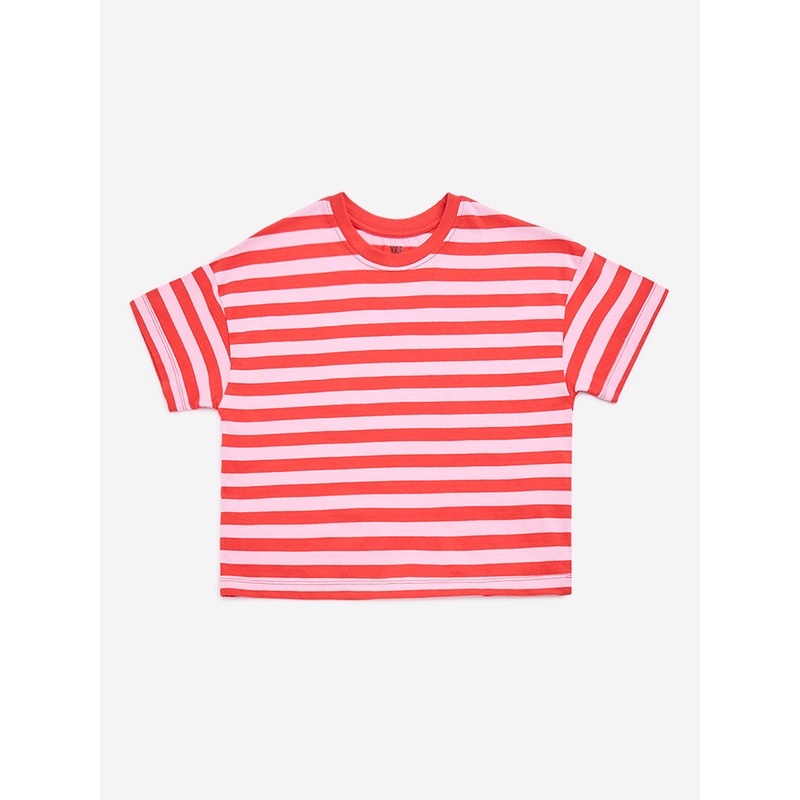 This red t-shirt from Y&F Kids is defined with stripe prints. Made from a cotton-rich fabric, it includes a crew neck and short sleeves.