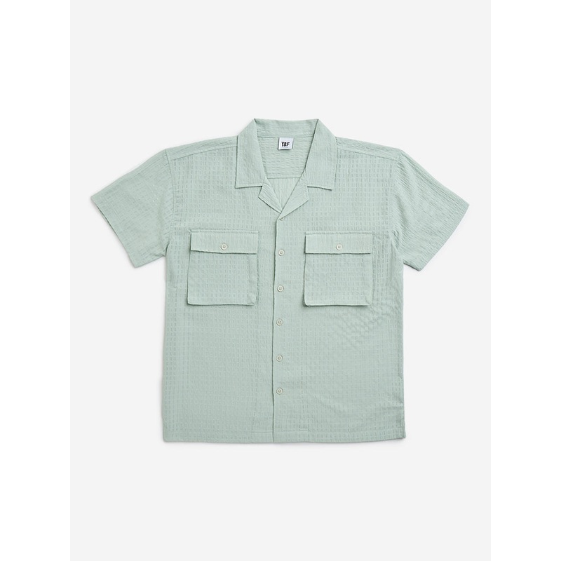 Y&F Kids features this sage shirt in textured design. Carved in a resort-fit frame, the pure cotton garment offers a camp collar, button down front, short sleeves and front pockets.