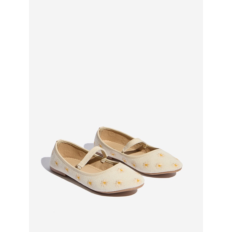 These beige Mary Jane shoes by Yellow feature delicate floral embroidery throughout the round toe silhouette, with a belted addition on the upper for a touch of charm. Designed with a soft insole and a textured outsole, they offer both comfort and stability for your little one.