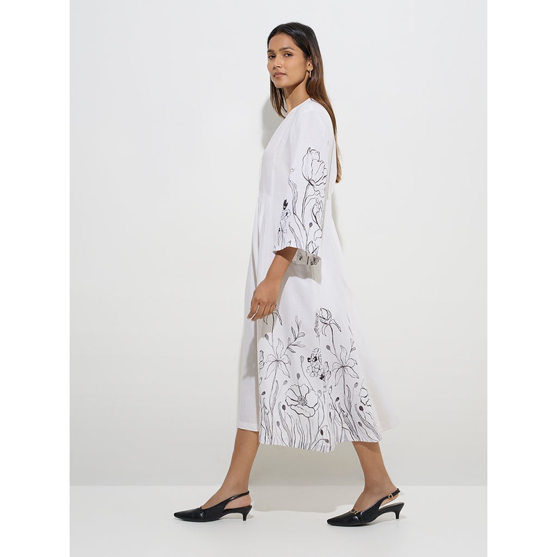 This white dress from Zuba is crafted from a sumptuous linen-blend fabric for a smooth, breathable feel. Designed with a mandarin neckline and a button placket, it offers a refined silhouette. The flared sleeves, adorned with intricate floral embroidery, add a touch of delicate detailing.